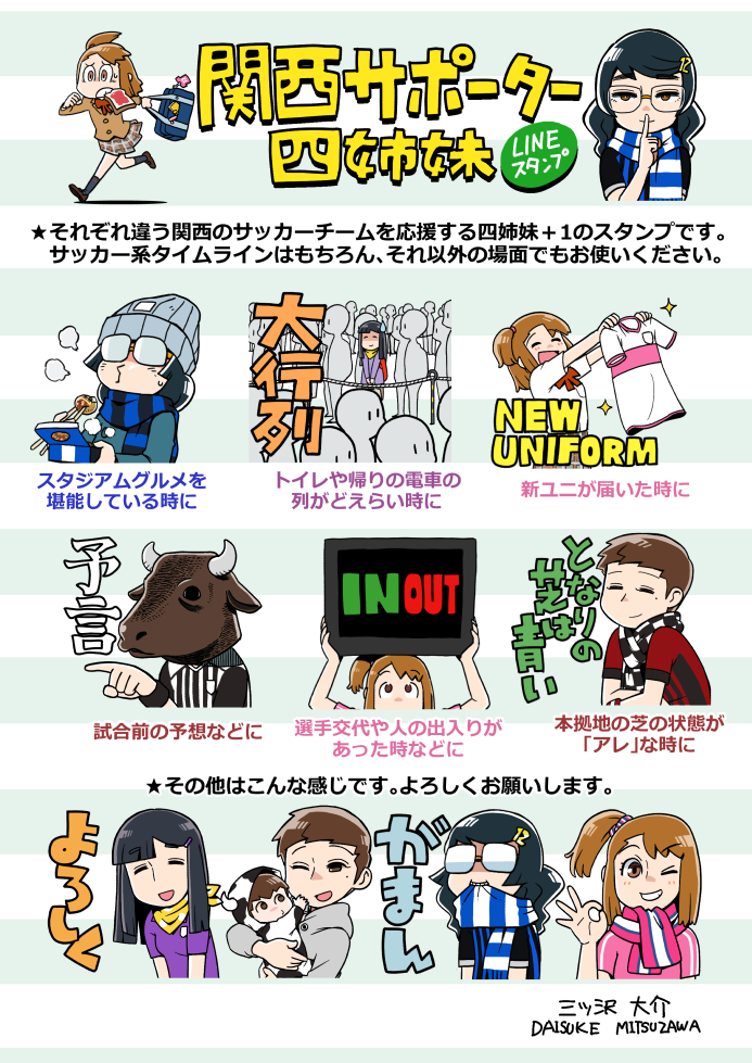 スタンプの名前は「関西サポーター四姉妹」。長女が京都、次女が神戸、三女がG大阪、四女がC大阪(をモチーフとしたチームのサポーター)です。