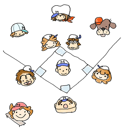 左の絵は先日、手慰みに描いた「とばせホーマーズ」の守備位置一覧表。